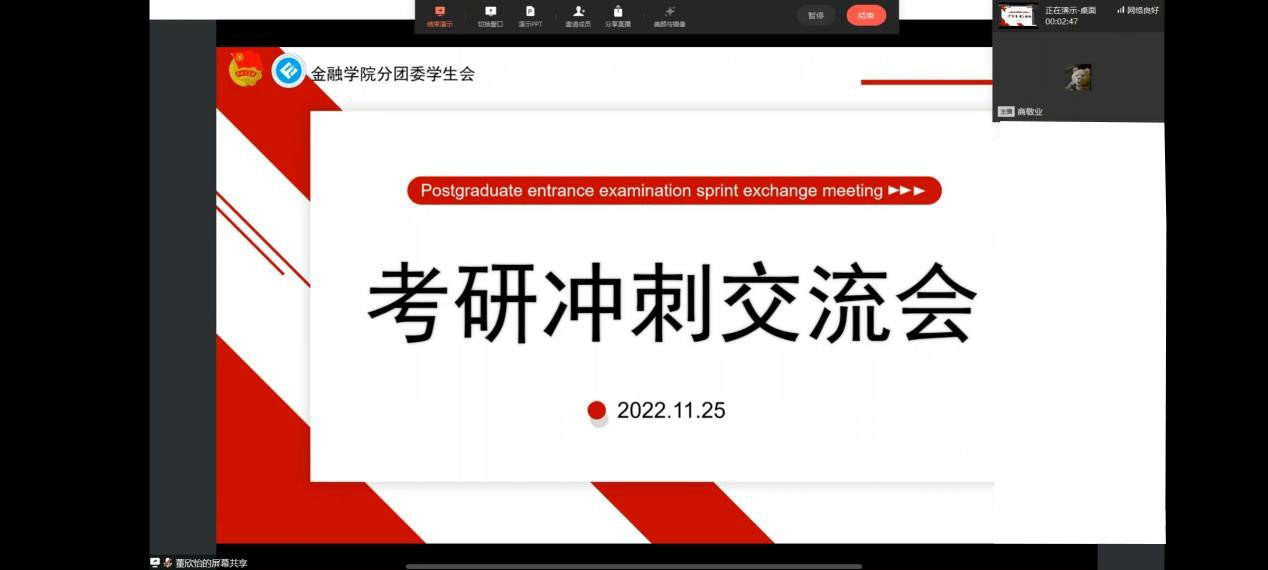 距2023年全国硕士研究生招生考试仅剩一个月,为给2023届考研学子加油鼓劲,助力考研学子坚定信心、调整状态、科学合理安排冲刺阶段的备考,11月25日19:30,bwin必赢(中国)在线登录入口在企业微信线上举办考研冲刺交流会。bwin必赢(中国)在线登录入口党委书记、副院长石世明,bwin必赢(中国)在线登录入口党委副书记、纪委书记余新参加了会议。同时邀请2022届考研成功的优秀校友为同学们分享经验,鼓舞信心。