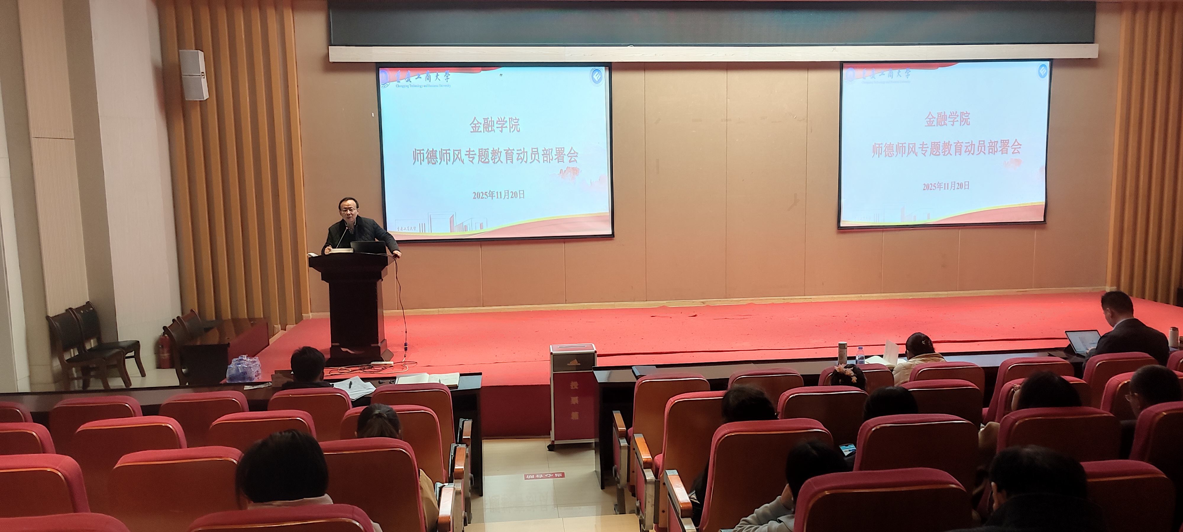 11月20日,bwin必赢(中国)在线登录入口根据《关于开展重庆工商大学2025年师德师风专题教育的通知》在田家炳209报告厅组织召开师德师风专题教育动员部署会,全体教职工参加会议。会议由党委书记、副院长石世明主持。