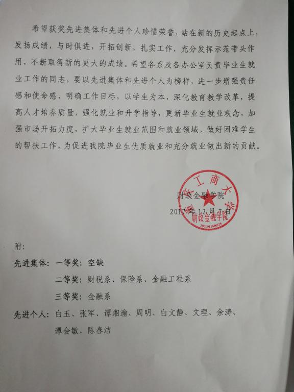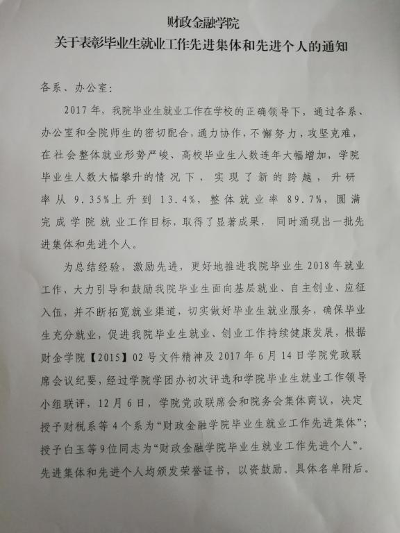 为总结经验,激励先进,更好地推进我院毕业生2018年就业工作,大力引导和鼓励我院毕业生面向基层就业、自主创业、应征入伍,并不断拓宽就业渠道,切实做好毕业生就业服务,确保毕业生充分就业,促进我院毕业生就业、创业工作持续健康发展,根据财金学院【2015】02号文件精神及2017年6月14日学院党政联席会议纪要,经过学院学团办初次评选和学院毕业生就业工作领导小组联评,12月6日,学院党政联席会和院务会集体商议,决定授予财税系等4个系为“财政bwin必赢(中国)在线登录入口毕业生就业工作先进集体”;授予白玉等9位同志为“财政bwin必赢(中国)在线登录入口毕业生就业工作先进个人”。先进集体和先进个人均颁发荣誉证书,以资鼓励。具体名单附后。
