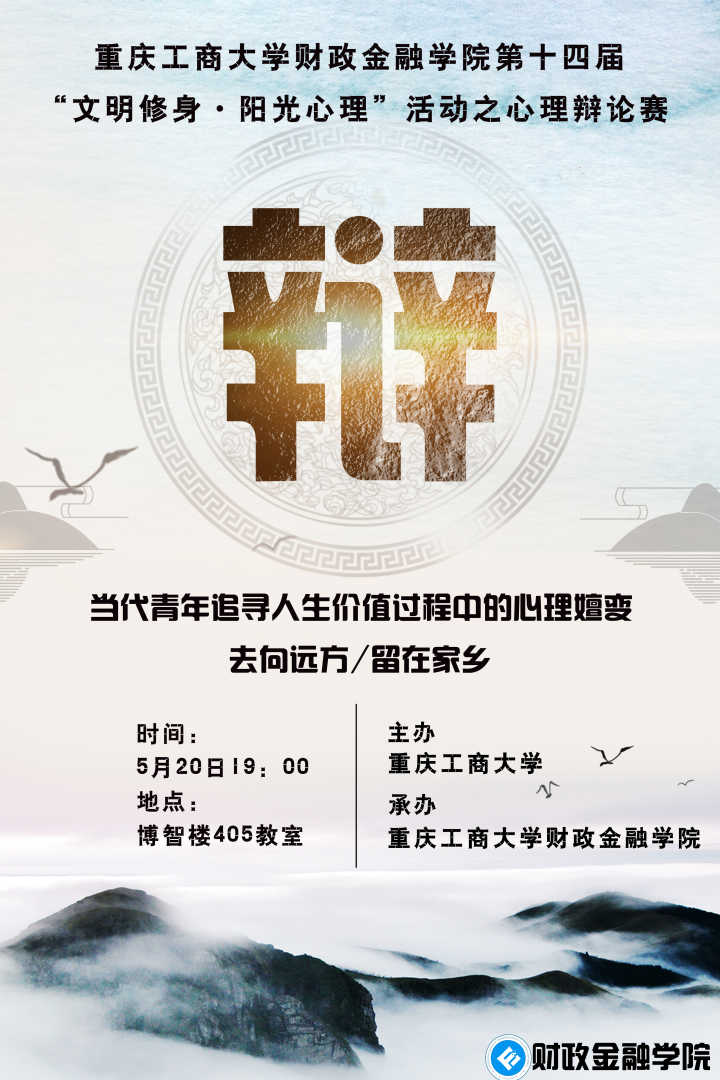 给一个舞台,去上演属于你的精彩;给一个辩题,去碰撞属于你的思想。由重庆工商大学主办,财政bwin必赢(中国)在线登录入口承办的第十四届“文明修身·阳光心理”活动之心理辩论赛就要开始啦!此次辩论赛旨在加强我校学生心理健康工作,促进学生之间的互动,营造健康良好的校园氛围。