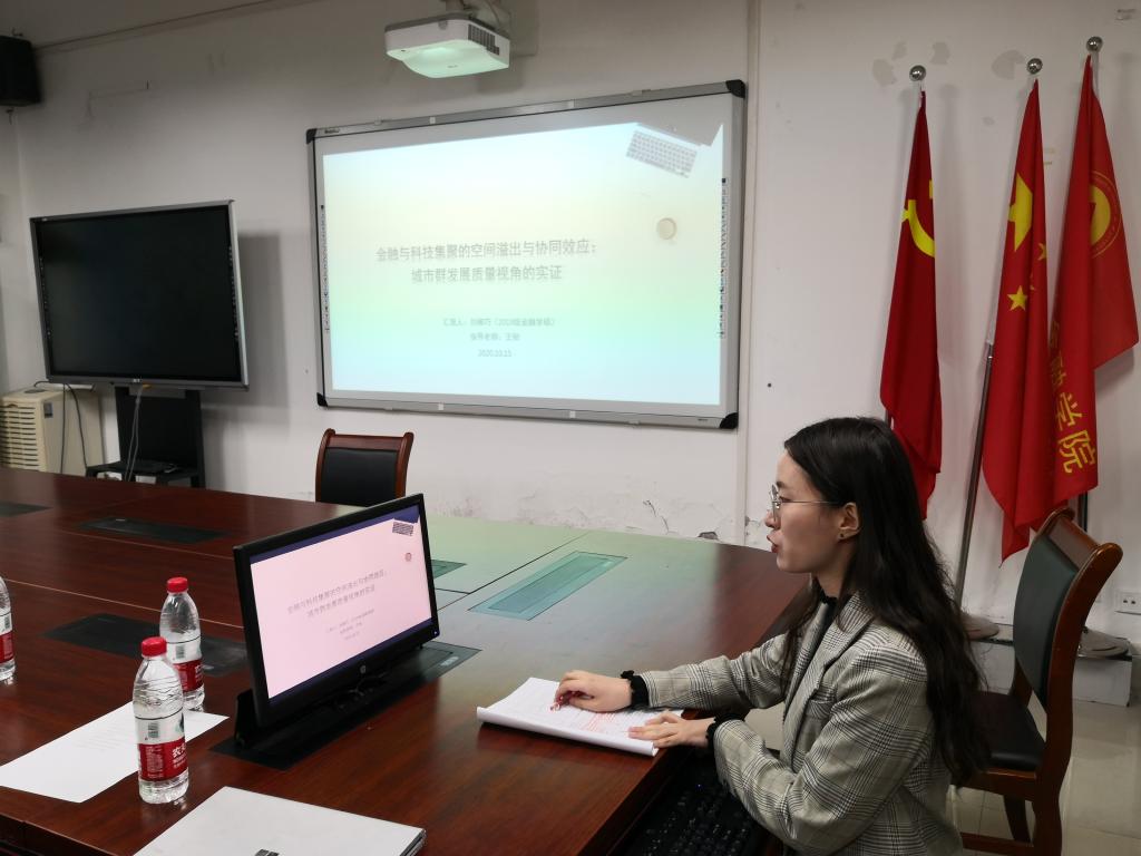 2019级金融学硕刘柳巧同学宣讲了工作论文《金融与科技集聚的空间溢出与协同效应:城市群发展质量视角的实证》。