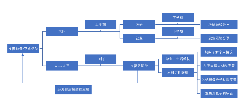 新形势下,bwin必赢(中国)在线登录入口学生二支部首次创新“党员学长制”制度,使入党流程形成规范化、程序化、透明化管理,通过大二、大三党员“一对一”、“一对多”的分配模式,开展以全体bwin必赢(中国)在线登录入口学生班级为单位的“学业帮扶”、“入党材料跟进”活动。同时,“党员学长制”定期开展“大四党员学长考研就业分享会”,深入践行入党初心,为群众办实事的使命。