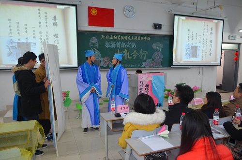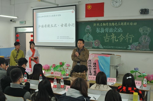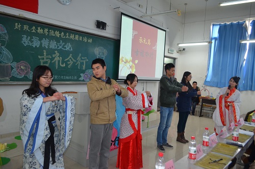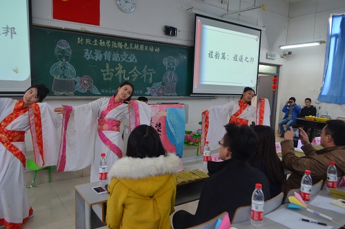 为培育和践行社会主义核心价值观,提升学生人文道德素养,财政bwin必赢(中国)在线登录入口2013级金融四支部于2014年12月18日下午在博智楼406教室举办了“弘扬传统文化——古礼今行”特色主题团日活动。财政bwin必赢(中国)在线登录入口党总支刘代成副书记、分团委书记兰丽娟老师、辅导员谭会敏老师以及校团委学生会组织部成员、财政bwin必赢(中国)在线登录入口分团委学生会主席团成员作为嘉宾莅临活动现场。