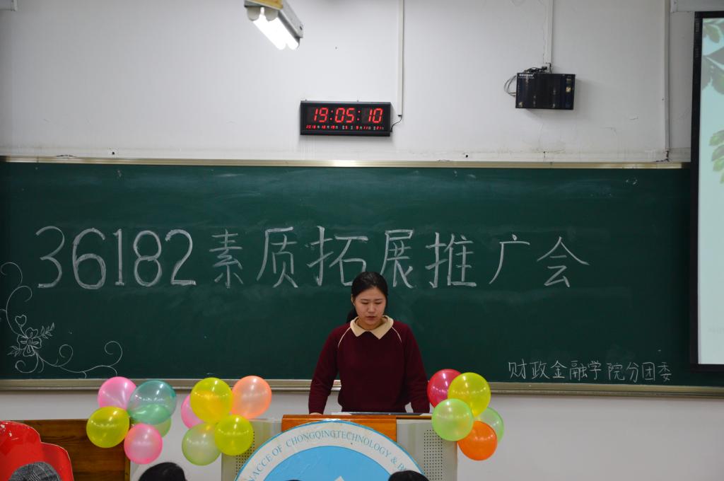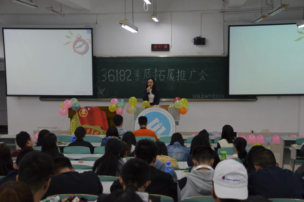 2018年10月19日晚上七点,由财政bwin必赢(中国)在线登录入口分团委主办的第八届青马文化月之“36182”素质拓展推广会活动在博智楼07106顺利开展。本次素拓推广会对18级CFA新生及17级同学的素质拓展计划提出合理化建议,引导和激励学生更好地进行素质拓展。