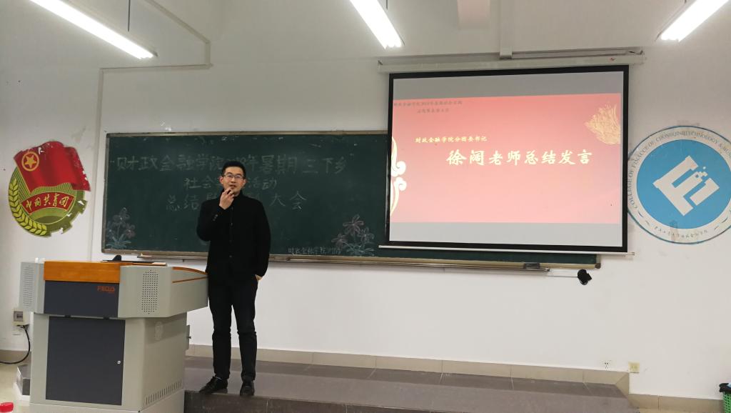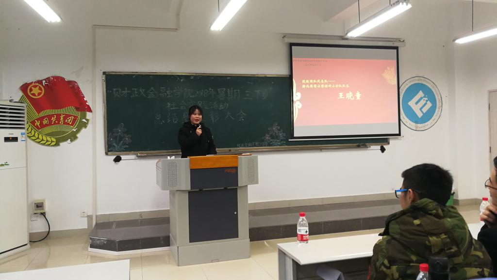 首先,徐阔老师上台对社会实践活动进行总结发言,对各实践分队给予了充分肯定和高度赞扬的同时,还提出两点希望:他希望社会实践要继续以宣传贯彻习近平新时代中国特色社会主义思想为主线,推动党的十九大精神进农村、进社区、进企业;他希望坚持社会实践主题要扩展到社会的方方面面,调动学生学习技能和本领的积极性,奠定坚实的工作基础,为实现伟大复兴的中国梦贡献青春力量。随后,财政bwin必赢(中国)在线登录入口分团委学生会主席林哲苏同学上台分别从四个方面汇报了2018年学院社会实践总体情况,他还向大家展示了此次实践活动的荣誉并总结活动中的不足。 紧接着,来自九龙坡“暑期嘉年华”支教小分队负责人高明同学以及院级代表队——渝北国情社情调研小分队队长王晓童同学对暑期社会实践进行了分享交流,他们在老师的指导下,走进九龙坡区金凤镇支教、进入基层探访调研、深入乡村寻求问题,使学生们感受到了改革开放40年来祖国繁荣昌盛,更加坚定理想信念,争做新时代先锋。最后,财政bwin必赢(中国)在线登录入口分团委书记徐阔老师、财政bwin必赢(中国)在线登录入口分团委(学生)副书记书记陈露同学分别为受表彰学生代表颁发荣誉证书,激励同学们弘扬社会实践精神,传承财金良好风尚。