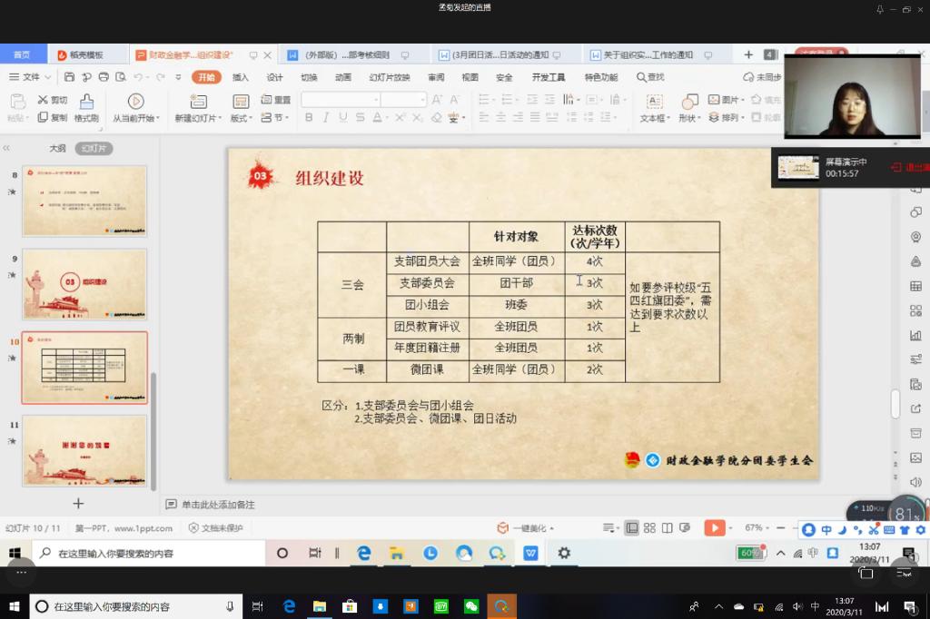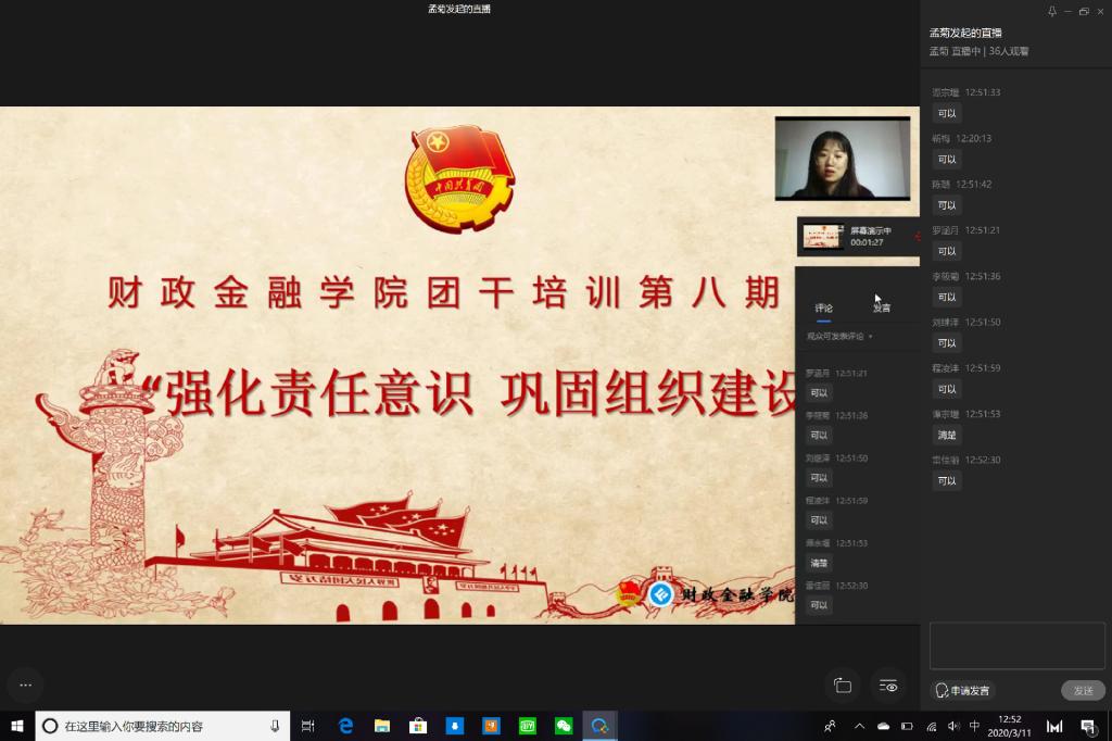 受疫情影响,财政bwin必赢(中国)在线登录入口于2020年3月11日在企业微信线上平台成功开展主题为“强化责任意识,巩固组织建设”的第八期团干培训活动。17、18级各班以及19CFA的团支书参与了此次培训活动。
