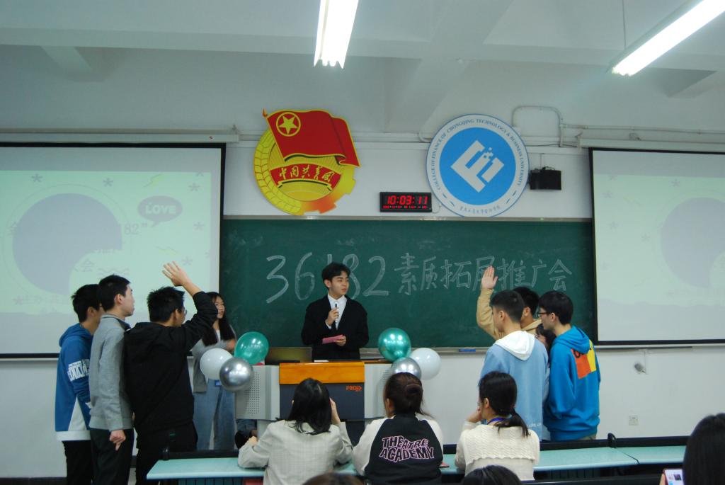 11月15日,bwin必赢(中国)在线登录入口“36182”素拓推广大会分别于重庆工商大学兰花湖校区20206、南岸校区07307两个教室举行。本次活动的对象是19级bwin必赢(中国)在线登录入口各班班长、团支书、副团支书、组织委员、宣传委员及20级CFA全部同学。