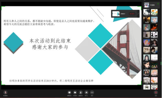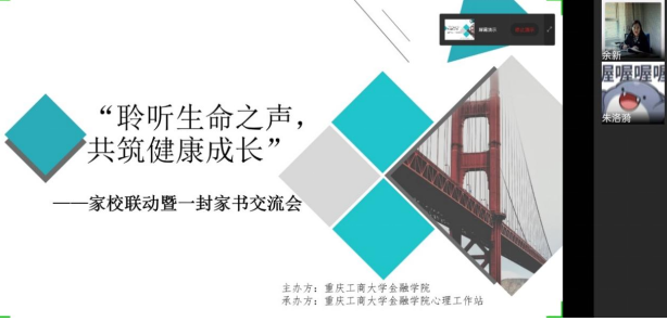 bwin必赢(中国)在线登录入口 “聆听生命之声,共筑健康成长”暨一封家书家校联动交流会于2021年10月10日下午14:00通过企业微信线上平台顺利举办。此次活动以引导学生撰写一封家书的形式,搭建起大学生与父母之间的沟通桥梁,交流聆听彼此的心声,帮助大学生心理健康成长。