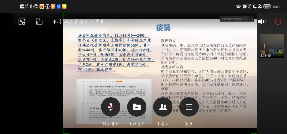 为让同学们更加深入了解新冠疫情近况,持续做好疫情防控措施,弘扬抗疫精神,12月17日晚上20:00,bwin必赢(中国)在线登录入口在企业微信开展了“弘扬抗疫精神 展现民族力量”主题活动。bwin必赢(中国)在线登录入口各班班长、团支书以及分团委学生会和青年志愿者服务队骨干成员参与了会议。会议由bwin必赢(中国)在线登录入口分团委学生会部门负责人孔令旗主持。