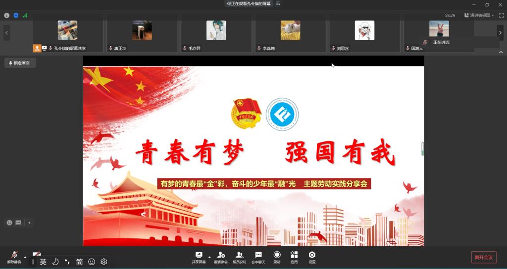 为鼓励同学们积极参与劳动实践活动,树立正确的价值观、劳动观、成才观, 4月10日20:30,bwin必赢(中国)在线登录入口于企业微信开展了“有梦的青春最‘金’彩,奋斗的少年最‘融’光”主题劳动实践分享会。本次分享会由bwin必赢(中国)在线登录入口分团委社会实践部部门负责人孔令旗主持,会议邀请到四位同学为大家分享劳动实习经验和志愿服务经历。