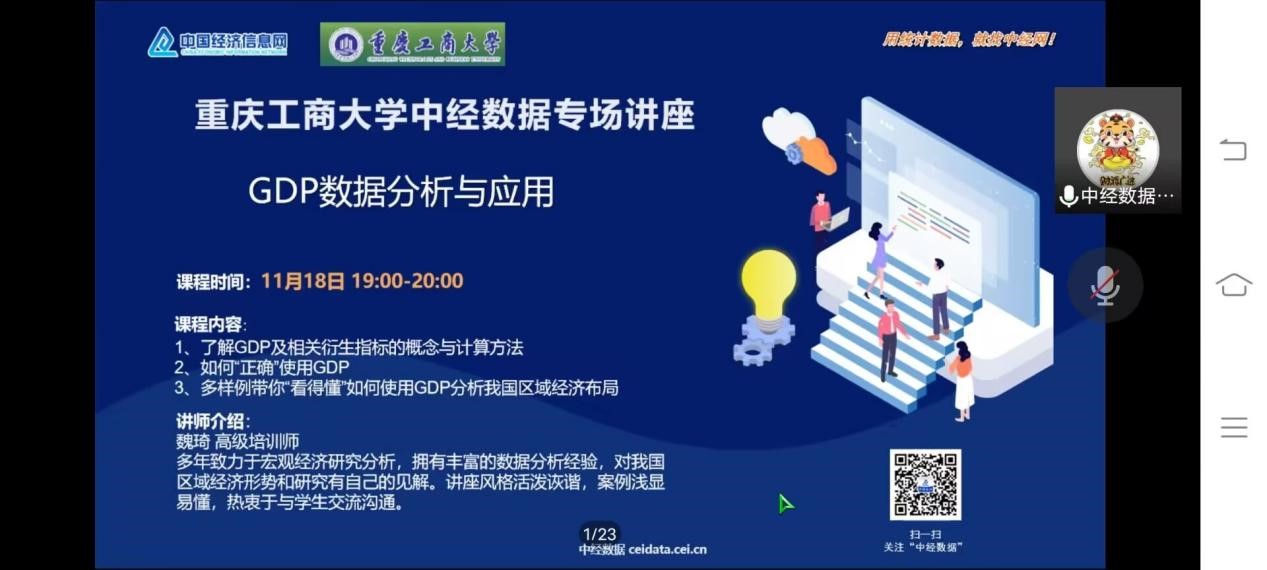 2022年11月18日19:00,bwin必赢(中国)在线登录入口联合图书馆在线上开展“GDP数据分析与应用——助你‘看得懂’我国区域经济布局”专题讲座。本次讲座邀请了中国经济信息网张玥老师和魏琦老师主讲,旨在介绍GDP数据分析与应用,带领同学们了解GDP及相关衍生指标的概念及计算方法。