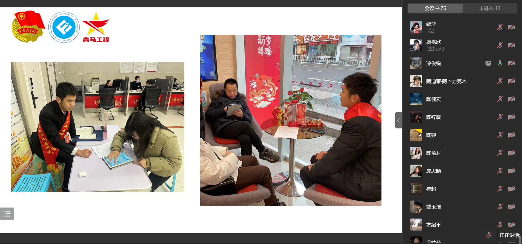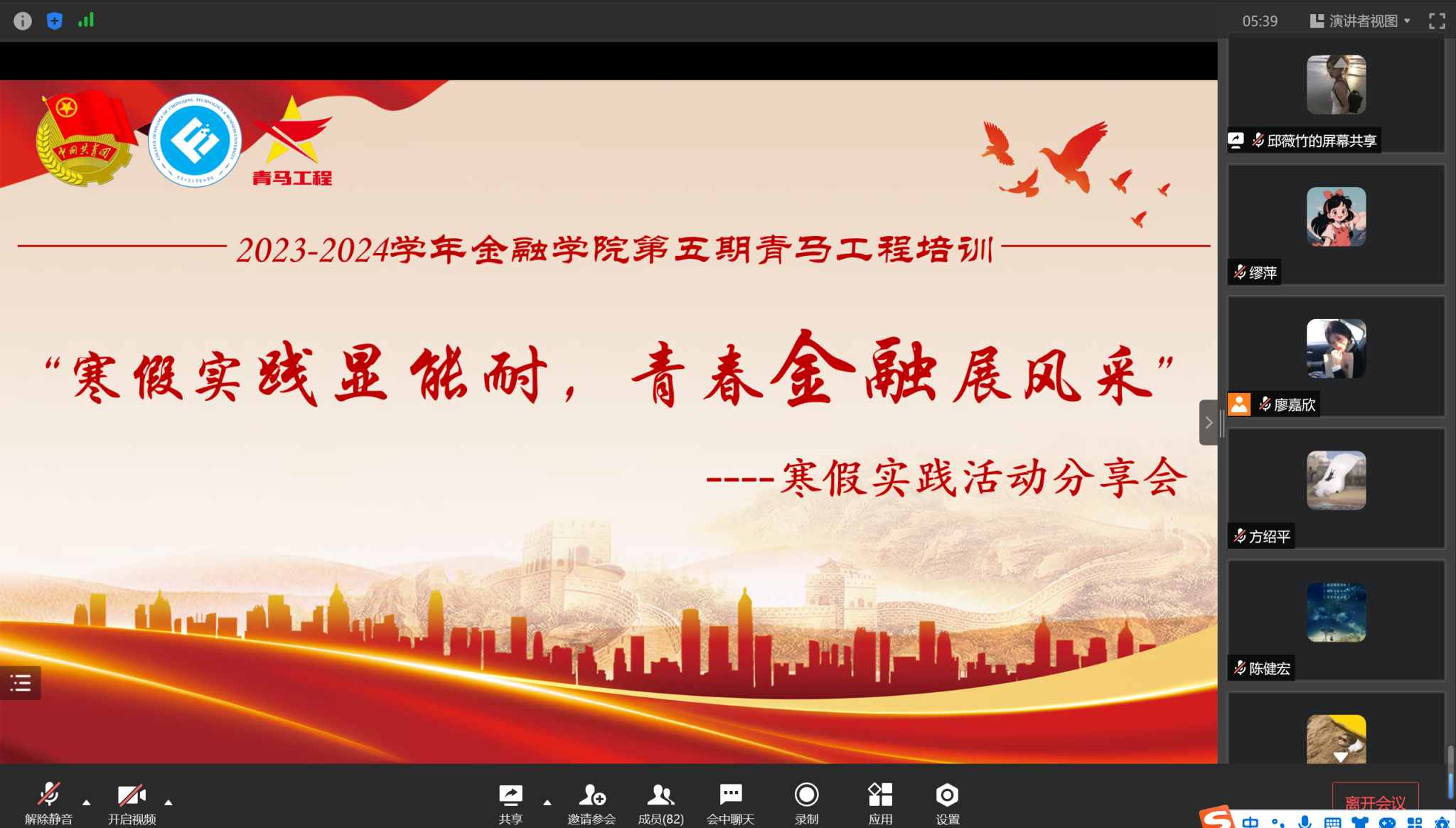 为展示金融学子2024年寒假社会实践风采,引导金融学子通过社会实践深入学习党的二十大精神,正确把握前进方向,2024年3月13日21:45,bwin必赢(中国)在线登录入口以“寒假实践显能耐,青春金融展风采”为主题的第五期青马工程培训在企业微信线上成功举行。本次培训邀请了寒假社会实践优秀学子邱薇竹、冷俊锐进行实践经验分享,会议由廖嘉欣主持。