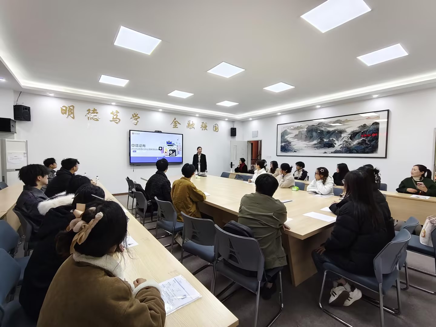 宣讲会上,李梦诗全面介绍了中信证券的行业地位、发展历程与全金融业务布局,以详实数据展现公司稳健经营实力。她重点围绕本次招聘岗位,详细讲解岗位核心职责、定制化培养体系、薪酬福利结构与多元化职业发展通道,清晰展示从基础业务学习到成长为后备干部、专业精英或管理人才的完整晋升路径,让同学们对职业前景与成长空间有了清晰认知。同时,她还分享了金融行业发展趋势与职场成长建议,鼓励同学们把握机遇、提升专业能力,在财富管理领域实现价值。