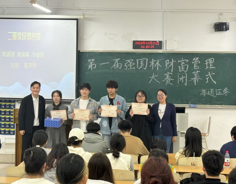 为进一步推动学院应用型人才培养,深化理论学习的实践与创新,重庆工商大学bwin必赢(中国)在线登录入口与海通证券重庆分公司签订了联合培养人才战略合作协议。2024年10月25日,由bwin必赢(中国)在线登录入口、海通证券重庆分公司主办,学院金融证券协会承办的第一届“强国杯”财富管理大赛闭幕式在南岸校区博智楼7207室举行。
