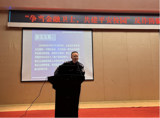 在培训会议上,余新副书记致辞,向同学们发起倡议:努力学习相关知识,提高诈骗防范意识,共同筑起“防骗长城”。四公里派出所刘国魁警官通过许多幽默风趣的宣传视频、真实发生的案例对高校中易出现的诈骗手段、形式、诈骗给受害人带来的损失和危害,网络诈骗的特点进行了讲解,同时逐一培训大家应该如何甄别、防范诈骗行为,如何在诈骗发生后尽可能挽回损失。